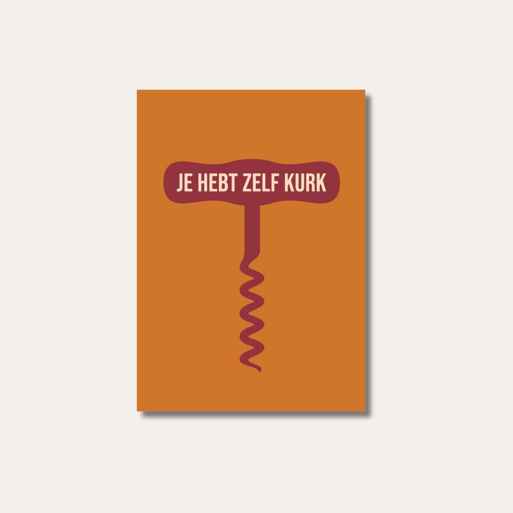 Die Grußkarte „Je Hebt Zelf Kurk“ besteht aus hochwertigem Papier mit einer feinen, matten Oberfläche, die Luxus und Qualität ausstrahlt. Das Design ist schlicht, aber wirkungsvoll – eine Anspielung auf die Welt des Weins, kombiniert mit verspielten typografischen Elementen, die perfekt zum Gefühl eines entspannten Abends mit Freunden passen. Der Text ist subtil und witzig, sodass die Karte nicht nur eine Botschaft vermittelt, sondern auch ein Lächeln hervorruft.