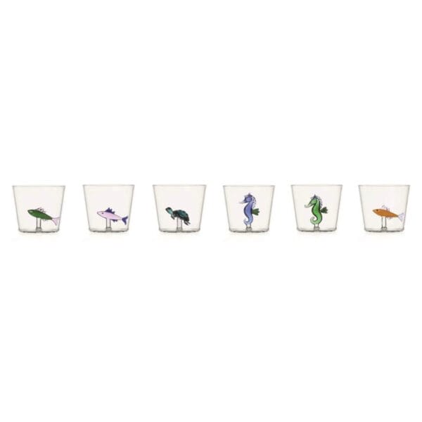 The figurines in the glasses are entirely handmade and flame-finished, giving each tumbler its own unique character. The combination of clear glass and cheerful colors makes this set extra versatile. It's perfect for a summery garden table, an everyday lunch, or a stylish drinks reception with striking water glasses. Moreover, the miniatures almost seem to move when the glass is tilted, as if the creatures are coming to life.