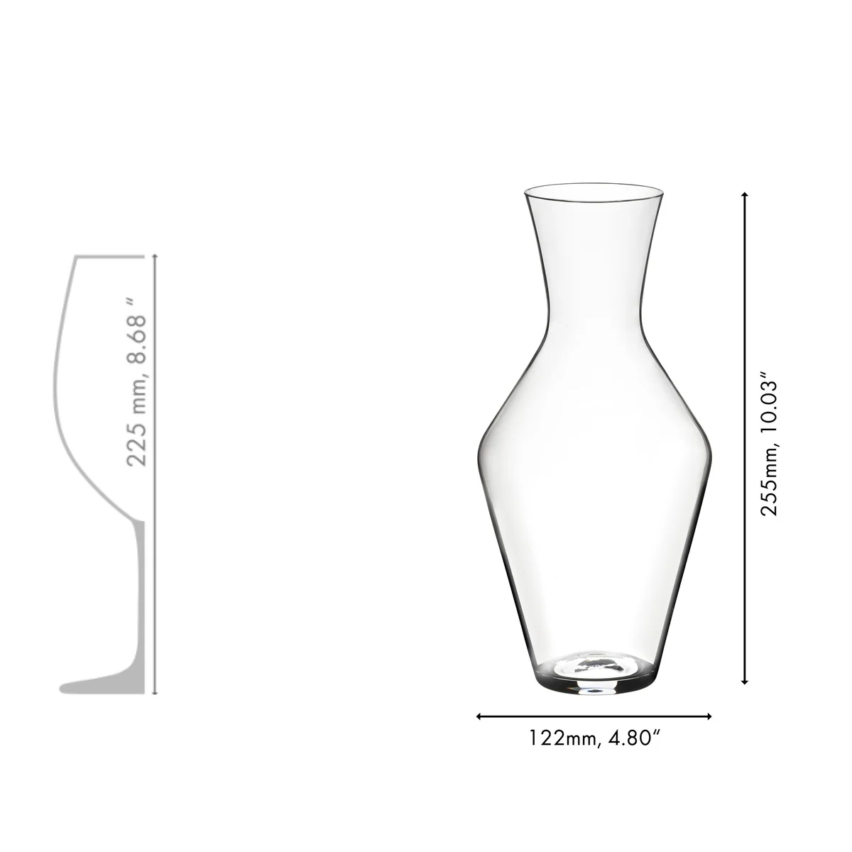 The sleek silhouette of a maximum of 12.2 centimeters and a height of 25.5 centimeters give the decanter a calm, modern look at the table. The use of clear crystal glass fully reveals the color, depth, and clarity of the wine, enhancing the pouring experience. The decanter is machined to the RIEDEL PREMIUM standard, focusing on precision in shape and wall thickness. This production method results in a consistent and sleekly finished product suitable for frequent use, without compromising appearance or quality.