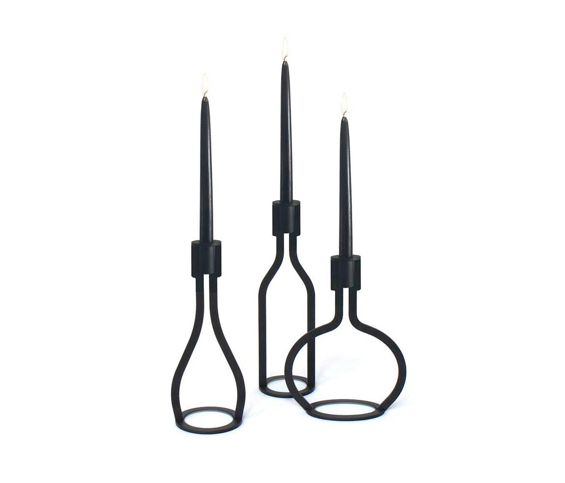 De Bottle Kandelaars zijn gemaakt van 4 mm dik staal en afgewerkt met een matte, zijdezwarte poedercoating. Door de open vorm ontstaat een grafisch lijnenspel dat elegant contrasteert met het warme licht van een brandende kaars. Elke uitvoering is gebaseerd op een ander type fles: